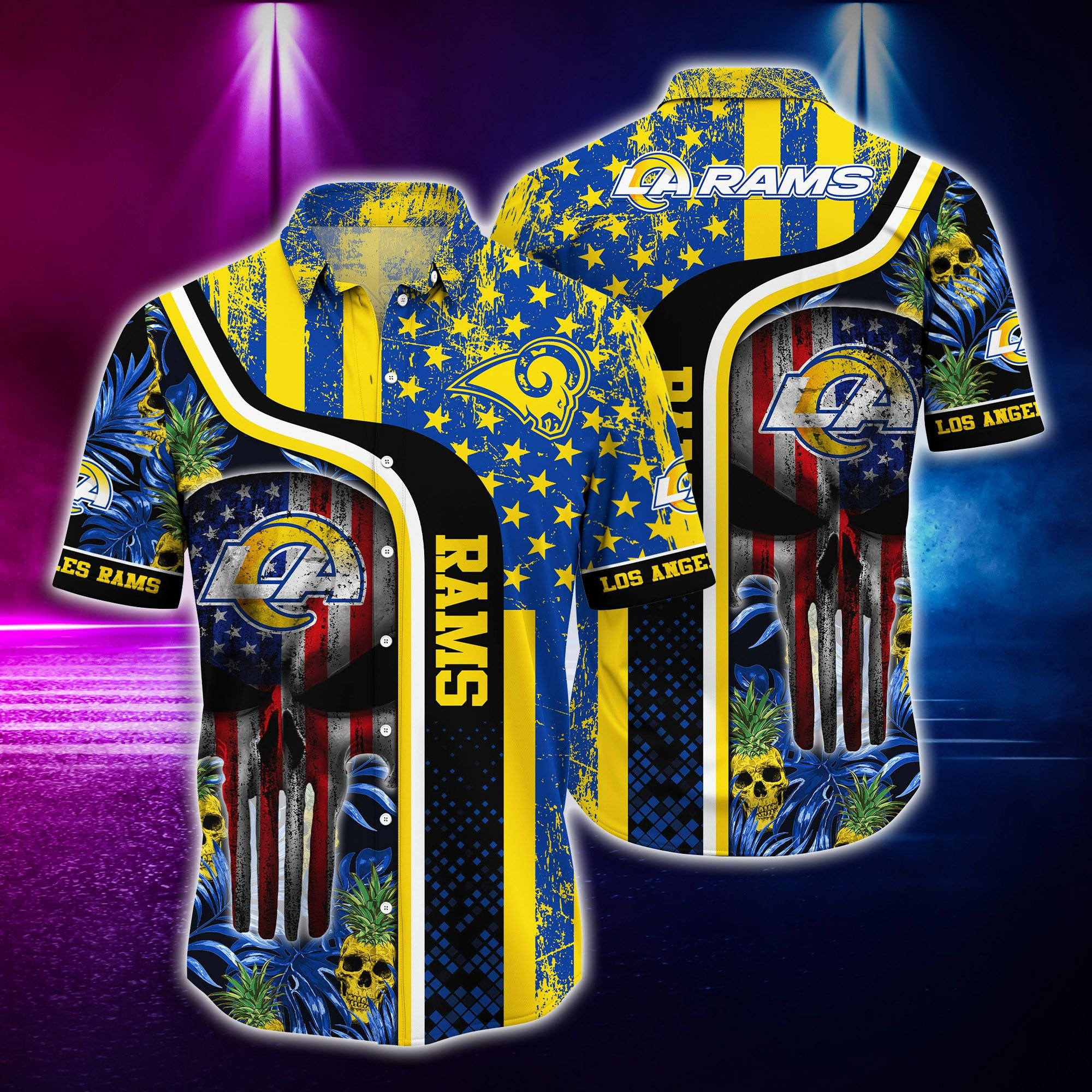 Embrace the Island Spirit: Our Premium Los Angeles Rams Skull US Flag Hawaiian Shirt